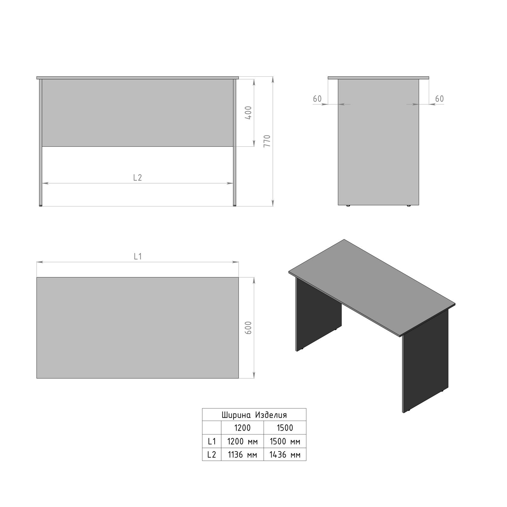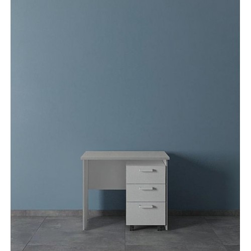 Стол письменный выполнен из ламинированной ДСП. Состоит из столешницы, двух боковых опор и поперечной царги. Толщина столешницы - 16 мм. Дополнительно может комплектоваться подкатными тумбами.