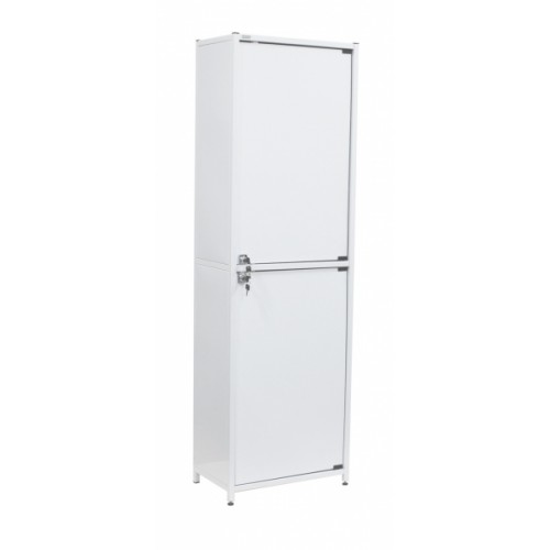 Шкаф имеет два отделения, каждое из которых укомплектовано металлическими дверцами с замком и металлическими полками. В верхем отделении две полки, в нижнем - одна.