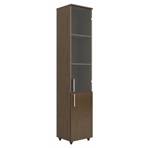 Шкаф высокий с дверцами используется в общественных помещениях различного назначения, для оснащения рабочих мест. Изделие предназначено для хранения канцелярских принадлежностей, документов, сочетает в себе рациональность конструкции и надежность эксплуатации. Шкаф установлен на регулируемые опоры высотой 50 мм. Шкаф имеет два отделения: верхнее со стеклянной дверцей, нижнее с дверцей ил ЛДСП. Расстояние между полками: 330-375 мм.